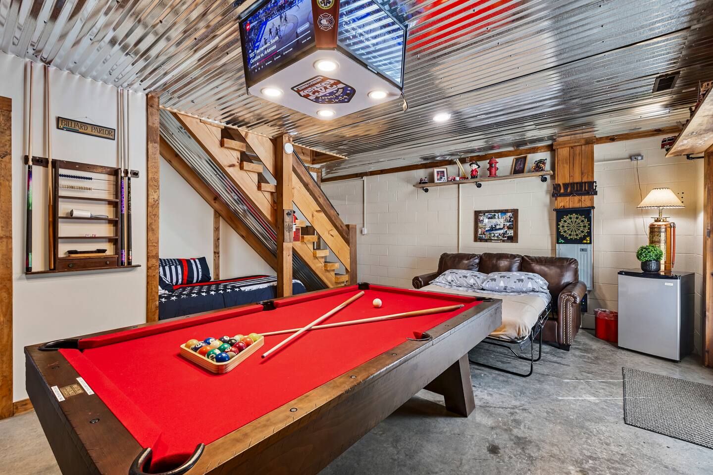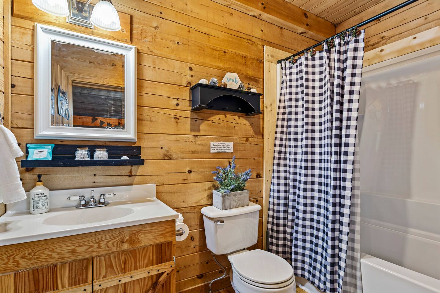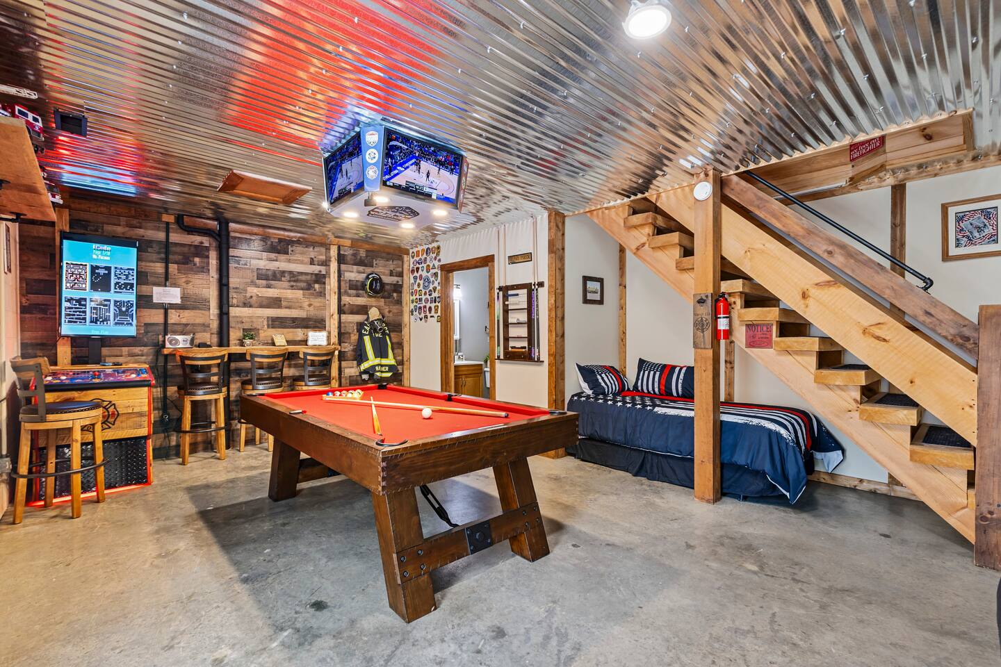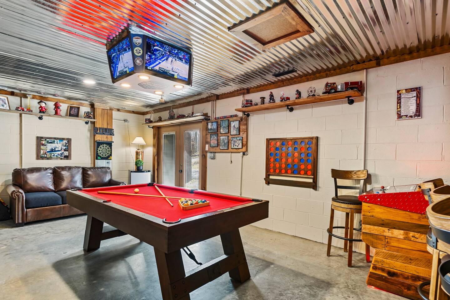 As soon as you step foot in this beautiful three-floor cabin, you're greeted by the gorgeous yet highly comfortable open-concept living area, decorated in an elegant manner that complements the picturesque Ponderosa community location. The fully equipped kitchen blends with the dining area, offering a space to cook and enjoy tasty delicacies with your loved ones before unwinding in the relaxing living room, setting the scene for unforgettable evenings. Natural sunlight bursts through many windows, making the home shine bright during the day, accenting the wooden build and carefully chosen furniture, and enhancing the pleasant setting. Rest in the three comfortable bedrooms, which boast 5* comforts that allow you to recharge after an exciting day of outdoor activities. But wait! The best is yet to come! Step out onto the wraparound deck, where you can lounge on the rocking chairs and the porch swing or play cornhole. Or, completely unwind in the luxury hot tub outside in the woods. The deck overlooks the picturesque yard with the game area, fire pit, and picnic area. Let the designated BBQ master work their magic on the propane grill while you try your luck by fishing at the private Ponderosa catch-and-release Bass pond. When you've had enough of the great outdoors, you can retreat to the basement firefighter-themed game room and have a fun tournament to decide who takes the crown of the Ponderosa pool champ, or the arcade game with 60 classics There's so much to do in this inviting cabin. We look forward to you experiencing its complete comfort and coziness. ★ LIVING ROOMS ★ You will feel right at home! Sink into the comfortable sofa by the fireplace, take a moment to unwind, watch your favorite show, play board games, or plan your upcoming adventures. ✔ Comfortable Leather Sofa with Pillows ✔ Smart TV with Xfinity and Roku ✔ Board and Card Games ✔ Fireplace ✔ Comfortable Sofa Chair ✔ Stylish Coffee Tables ✔ Access to the Deck ★ KITCHEN & DINING ★ This fully equipped kitchen boasts modern appliances, making it easy to whip up anything from delicious breakfasts to gourmet dinners. With ample countertops, you'll have plenty of room to showcase your culinary skills. ✔ Microwave ✔ Stove ✔ Oven ✔ Toaster ✔ Hot Water Kettle ✔ Refrigerator/Freezer ✔ Dishwasher ✔ Sink - Hot & Cold Water ✔ Plates ✔ Glasses ✔ Silverware ✔ Pots & Pans Unwind and catch up with your loved ones on the lavish deck while the food is prepared. When done, gather at the dining table and savor a delicious meal in a warm and inviting atmosphere. ✔ Dining Table with Seating for 5-6 ✔ Coffee (Keurig Machine, Drip Coffee Maker) ★ SLEEPING ARRANGEMENTS – 3 BEDROOMS ★ After an exciting day of exploring the thrilling Knoxville attractions and Smokey Mountains natural landmarks, you will look to rest for an equally entertaining tomorrow. Once you are ready to relax, please make your way to these comfortable bedrooms. ♛ Master Suite (Upper Floor): King-Size Bed, HDTV, Ensuite Bathroom ♛ Bedroom 2 (Main Floor): Queen-Size Bed ♛ Bedroom 3 (Basement): Queen Bed & twin roll-away bed in Bedroom, Full Pull out couch, twin bed under stairs in game room & blowup mattress for anywhere you want to put it. All bedrooms share a similar set of amenities. ✔ Premium Mattresses, Linens, Sheets, and Pillows ✔ Closets with Hangers and Shelves (Walk-In in Master) ✔ Dressers with Spacious Drawers ✔ Night Stands with Reading Lamps and Device Chargers ★ BATHROOMS ★ In addition to the master bedroom's ensuite bathroom, the home features additional two full bathrooms on each floor. All are stocked with essential toiletries and pampering towels to ensure a carefree stay. ✔ Walk-In Shower ✔ Bathtub with a Shower ✔ Vanity ✔ Mirror ✔ Toilet ✔ Towels ✔ Hair Dryer ✔ Costco size Essential Toiletries ★ GAME ROOM ★ Come to the firefighter-themed game room in the walkout basement to discover numerous relaxing and entertaining amenities. Be careful, though. You'll quickly lose track of time in this fun space! ✔ Firefighter Classic Arcade with 60+ Games ✔ Connect 4 Wall Game ✔ Pool Table ✔ Board Games ✔ Mini Jumbotron with 4 TV's to watch ✔ Comfy Seating Areas ✔ Mini Fridge ✔Firefighter themed Twin bed under stairs ✔Pull-out couch ✔Bar with stools ✔ Access to the Yard ★ DECK, YARD & COMMUNITY POND ★ A stunning getaway would not be complete without a private space where you can take in the serenity and beauty of the outdoors. Step onto the wraparound deck to catch a breath of fresh air and completely unwind in the luxurious hot tub. ✔ Luxurious Hot Tub (in the Covered Pad) ✔ Porch Swing ✔ Rocking Chairs and Log Tables ✔ BBQ Grill (Propane) ✔ Ceiling Fans ✔ Ring Toss Game The spacious yard offers more areas to create memorable moments with family and friends. ✔ Picnic Table with Benches ✔ Fire Pit with Surrounding Seating (firewood for sale on property) ✔ Game Area (Horse Shoe Pit, Cornhole, Tetherball Pole) The deck and yard are completely private, while the magical pond is accessible by guests in all four of our cabins. It offers a perfect place to immerse yourself in natural tranquility and try your luck at catching bass and bluegill. ✔ Catch-and-Release Pond with a Fountain ✔ Hammocks Find your happiness in this attractive retreat. It offers a place to escape the hustle and bustle of everyday life, have fun in the game room, watch a movie, unwind in the hot tub, and explore exciting natural attractions. Don't hesitate to contact us with any questions you may have. Happy Travels!